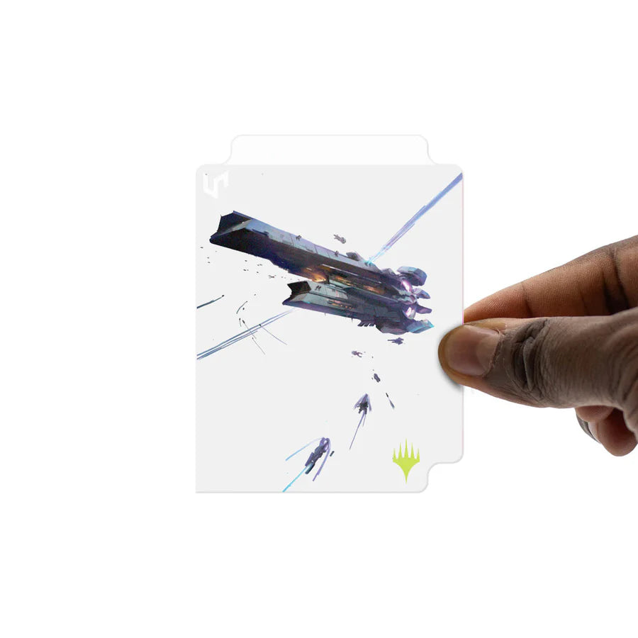 The 100ct Deck Protector Sleeves in Clear Box includes 100 Deck Protector sleeves, a transparent plastic 100+ Deck Box®, and a deck divider, all featuring aligning artwork from Edge of Eternities. The sleeves are made using Ultra PRO’s proprietary ChromaFusion technology to minimize delamination, and the 100+ Deck Box® and divider are made from a clear rigid polypropylene material. All materials are non-PVC and archival-safe to provide premium protection.